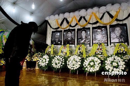6月13日,四川大地震救援中失事直升機(jī)遇難機(jī)組人員遺體告別儀式在成都市殯儀館舉行,來自軍方及社會(huì)各界的人士紛紛前來送別英雄。圖為成都軍區(qū)陸航團(tuán)在鳳凰山機(jī)場(chǎng)搭設(shè)靈堂,悼念在汶川大地震救災(zāi)行動(dòng)中失事直升機(jī)上5位遇難機(jī)機(jī)組人員。中新社發(fā) 劉新 攝