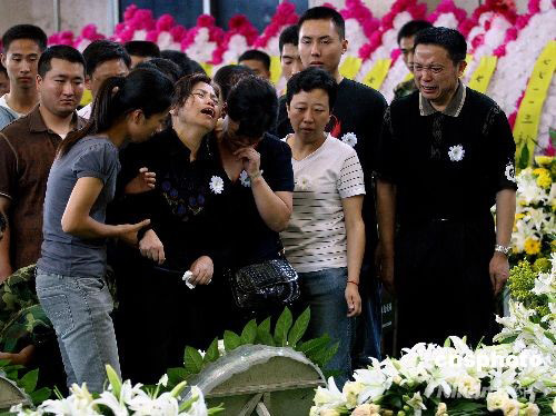6月13日,四川大地震救援中失事直升機(jī)遇難機(jī)組人員遺體告別儀式在成都市殯儀館舉行,來自軍方及社會各界的人士紛紛前來送別英雄。圖為遇難機(jī)組人員家屬悲痛欲絕送別親人。中新社發(fā) 劉新 攝