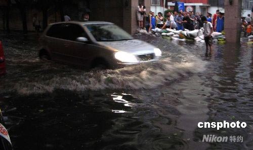 北京西城區(qū)一大院因暴雨積水,道路交通一時受阻。中新社發(fā) 鄒憲 攝
