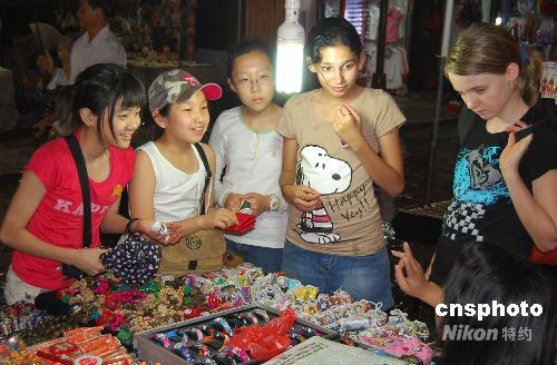 中外小朋友在廣西陽朔西街購(gòu)物。中新社發(fā) 龍燕秀 攝
