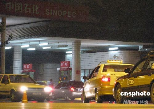國家發(fā)展改革委決定自2008年6月20日起將汽油、柴油價格每噸提高1000元,航空煤油價格每噸提高1500元。圖為6月19日深夜,北京部分司機獲悉成品油調(diào)價消息后,趕在20日凌晨零點前在加油站排起長龍加油。 中新社發(fā) 余瑞冬 攝