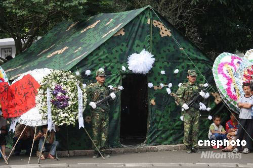 鐵軍為犧牲的抗震官兵武文斌搭建的簡(jiǎn)易靈棚。