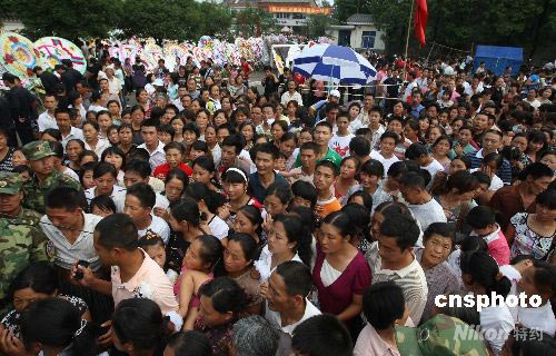 汶川地震災(zāi)區(qū)四川都江堰市胥家鎮(zhèn),在抗震救災(zāi)中犧牲的武文斌的簡(jiǎn)易靈堂前擠滿了數(shù)萬(wàn)前來(lái)悼念的民眾。中新社發(fā) 曾憲平 攝