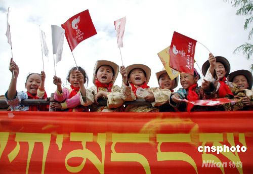拉薩市的藏族小朋友們穿上節(jié)日盛裝,在街頭歡慶奧運(yùn)火炬來到雪域高原。中新社發(fā) 周波 攝