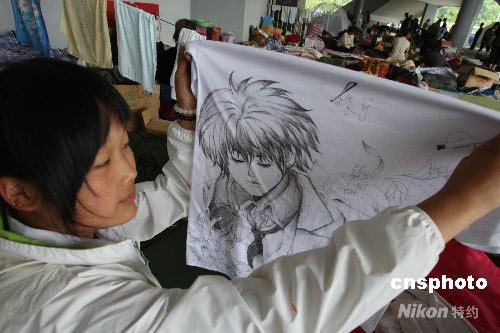 北川縣一位家園被毀的女孩在救援組織贈送的文化衫上繪出自己喜愛的卡通人像。中新社發(fā) 賈國榮 攝