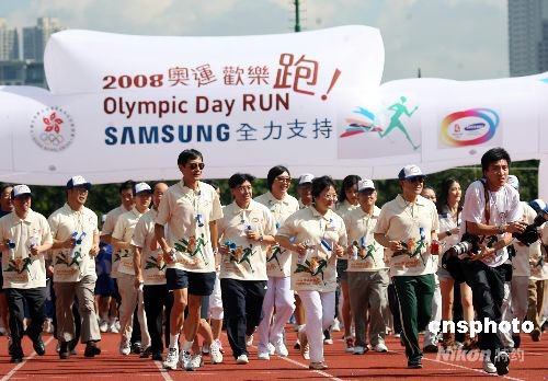 圖為港協暨奧委會會長霍震霆出席2008奧運歡樂跑活動。中新社發(fā) 武仲林 攝