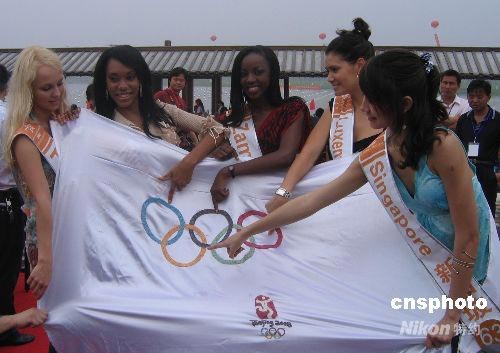 6月23日,參加一年一度世界休閑小姐總決賽的佳麗們來到蘇州中國珍珠寶石城舉行巡游活動。在珍珠湖畔,佳麗們親手穿線串珠,共同制作了由20888顆淡水珍珠匯成的奧運(yùn)五環(huán)旗,并奉上“預(yù)祝2008北京奧運(yùn)會舉辦成功”的美好祝愿。 中新社發(fā) 黃瑩 攝