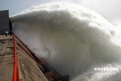 2008年6月23日,黃河小浪底水庫大流量下泄,再現(xiàn)飛瀑景觀。黃河第七次調(diào)水調(diào)沙2008年6月19日啟動以來,黃河小浪底水庫下泄流量逐步加大,通過小浪底水庫進行人為控制,以水沙相協(xié)調(diào),對下游河道進行沖刷,最終達(dá)到減少下游河道淤積的目的。中新社發(fā) 平白 攝