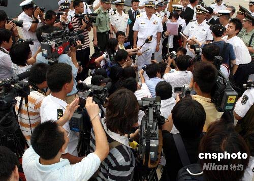 中日海軍高級(jí)將領(lǐng)在湛江碼頭接受者采訪