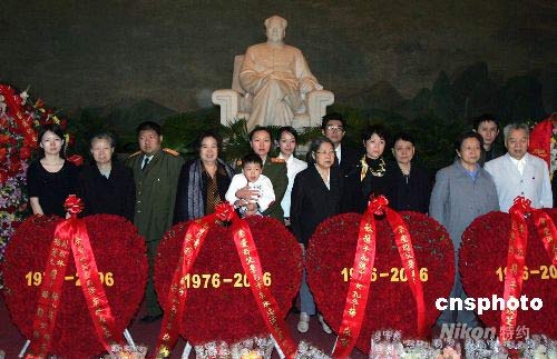 資料圖為2006年9月9日毛澤東逝世三十周年紀(jì)念日,毛澤東的親屬匯聚位于北京天安門廣場(chǎng)的“毛主席紀(jì)念堂”敬獻(xiàn)鮮花。劉思齊(左二,毛澤東長子毛岸英之妻)、毛新宇(左三,毛澤東之孫)、邵華(左四,毛澤東之子毛岸青妻子)、毛東東(左五,毛澤東重孫)、劉濱(左六,毛澤東孫媳婦)、李敏(左八,毛澤東女兒)、孔繼寧(左九,毛澤東外孫)、孔東梅(左十,毛澤東外孫女)、李訥(右三,毛澤東女兒)、王孝芝(右二,毛澤東外孫)、王景清(右一,毛澤東女婿)等獻(xiàn)花后,在毛澤東塑像前合影。中新社發(fā) 任晨鳴 攝