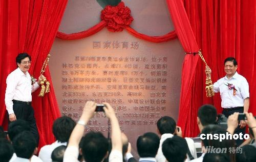 6月28日,2008年北京奧運(yùn)會(huì)主體育場(chǎng)(“鳥巢”)落成典禮在北京舉行,北京市委書記、北京奧組委主席劉淇與北京市委副書記、市長(zhǎng)、北京奧組委執(zhí)行主席郭金龍等參加落成典禮儀式。圖為劉淇、郭金龍為國(guó)家體育場(chǎng)落成紀(jì)念柱揭幕。中新社發(fā) 盛佳鵬 攝