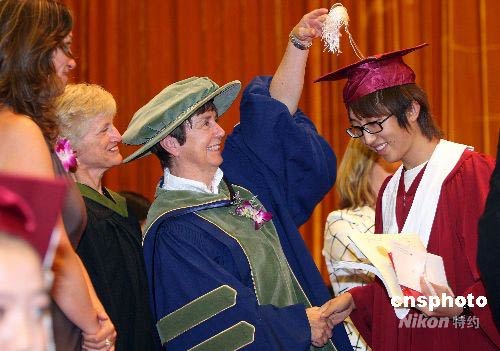 六月二十八日,北京中加學(xué)校2008年高中及IHM專業(yè)學(xué)生畢業(yè)典禮在北京人民大會(huì)堂舉行,321名學(xué)生經(jīng)過在該校三年的學(xué)習(xí),獲得中國和加拿大兩國高中畢業(yè)證書,其中有314名學(xué)生申請(qǐng)了加拿大的大學(xué),并被加拿大及歐美、澳大利亞共68所大學(xué)錄取,錄取率為100%。圖為加拿大教育官員為畢業(yè)學(xué)生撥帽繩。中新社發(fā) 毛建軍 攝