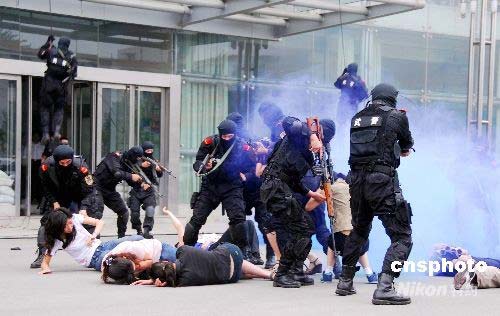 6月30日,山東省反恐怖工作協(xié)調(diào)小組在濟南成功舉行了“泰山2008”反恐演習。“泰山2008”反恐演習以北京奧運會期間可能發(fā)生的恐怖襲擊事件為背景,以有效防范和正確處置為課題,主要目的是檢驗和提升山東省城市防范處置恐怖襲擊事件的應急反應能力、組織指揮能力和綜合保障能力。這次演習是山東省第一次公安各警種與武警、衛(wèi)生、市政等反恐應急力量協(xié)同作戰(zhàn)的合成演習,是第一次以導調(diào)推演方式進行的檢驗性演習,也是第一次通過全省公安視音頻系統(tǒng)同步傳輸?shù)姆纯盅萘暋V行律绨l(fā) 陳 進 攝