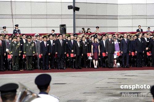 香港特區(qū)行政長官曾蔭權(quán)及特區(qū)政府官員、中央駐港聯(lián)絡(luò)辦公室、外交部駐港特派員公署、駐港部隊(duì)及眾多民眾參加升旗儀式。中新社發(fā) 王麗南 攝
