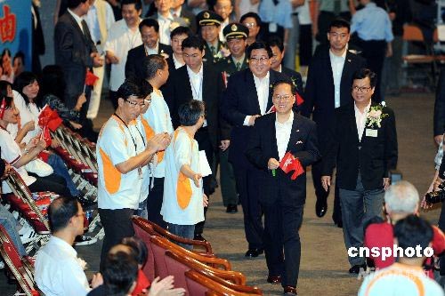 七月一日,香港回歸祖國十一周年紀(jì)念日,香港各界慶典委員會(huì)在香港體育館舉行盛大綜合文藝匯演,表達(dá)對汶川大地震災(zāi)后重建、慶祝香港回歸及北京奧運(yùn)的支持。特區(qū)行政長官曾蔭權(quán)、中聯(lián)辦主任高祀仁等嘉賓出席,并與現(xiàn)場數(shù)萬觀眾共同歡慶。中新社發(fā) 洪少葵 攝