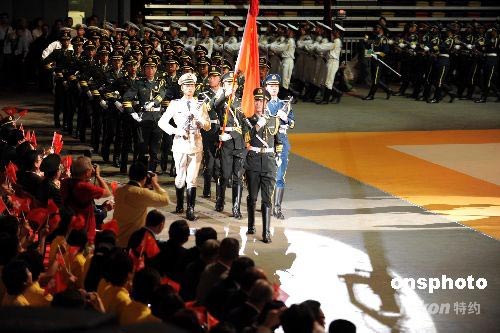 解放軍駐港部隊(duì)三軍儀仗隊(duì)列隊(duì)入場(chǎng)為匯演拉開(kāi)序幕。中新社發(fā) 洪少葵 攝