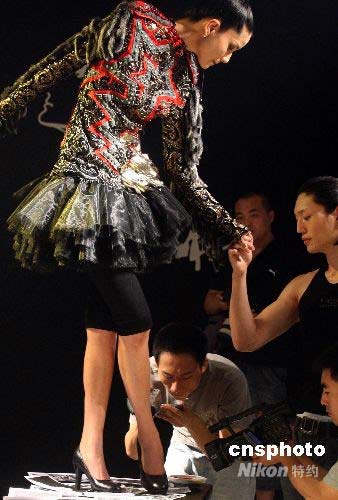 7月1日晚,“北京凱萊希模特學(xué)校2008年畢業(yè)匯報(bào)表演”在北京舉行。來自美國芝加哥大學(xué)博士Angela Zito編導(dǎo)創(chuàng)意的高跟鞋藝術(shù)秀別具特色,13位女模特,在中國傳統(tǒng)文士的書桌上表演走,坐,躺。男同學(xué)的加入令高跟鞋展現(xiàn)出男性和女性之間糾結(jié)的關(guān)系。名模陳娟紅最后登上書桌,穿上一雙鞋跟已經(jīng)被刻上圖章的高跟鞋,把圖章蓋在由這次活動(dòng)參與人員提供的照片上。這些照片代表著人們?cè)敢庵匦麦w味過去的生活情景,該怎樣面對(duì)記憶,是把他們?nèi)釉谝贿厜m“封”,還是不斷地重新“開”啟,探究著占有的象征,在現(xiàn)世和回憶之間的重新定位。圖為名模陳娟紅書桌上展示高跟鞋藝術(shù)秀。中新社發(fā) 錢興強(qiáng) 攝