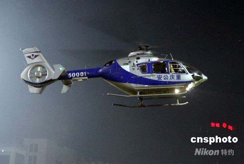 7月2日晚,重慶市舉行“迎奧運(yùn)、保平安”反恐綜合演練。此次演練是該市為做好2008年北京奧運(yùn)會(huì)安全保衛(wèi)工作,舉行的一次突出反恐實(shí)戰(zhàn)技能、對(duì)抗性強(qiáng)的綜合演練,演練由“處理暴力騷亂事件演練”、“加油站火災(zāi)和高樓救援”、“公共汽車反劫持演練”等3部分共9個(gè)項(xiàng)目組成。圖為重慶首架警用直升機(jī)在演練上首次公開亮相。中新社發(fā) 郭晉嘉 攝