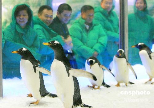 2008年7月3日凌晨,6只(3雌3雄)年齡分別為6至8歲的南極白眉企鵝從大連圣亞極地世界首次出遠(yuǎn)門,乘坐飛機(jī)抵達(dá)蘇州市高新區(qū)白馬澗生態(tài)園,應(yīng)邀參加以“極地科普、呼吁環(huán)保”為主題的“2008蘇州白馬澗冰雪狂歡飲料節(jié)”助游展演活動(dòng)。該活動(dòng)自7月5日起在該市舉行為期兩周。中新社發(fā) 蘇秀 攝