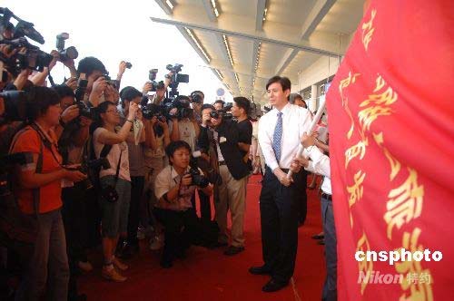 7月4日上午,赴臺(tái)旅游福建首發(fā)團(tuán)暨周未包機(jī)首航儀式在廈門(mén)高崎國(guó)際機(jī)場(chǎng)候機(jī)摟舉行。福建省洪捷序副省長(zhǎng)(右一)到場(chǎng)祝賀,并向“赴臺(tái)旅游福建首發(fā)團(tuán)”授旗。中新社發(fā) 鄭祚聲 攝
