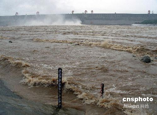 2008年7月5日,大雨中的三峽大壩開啟6個深孔泄洪,每秒下泄流量11000立方米,這是三峽工程2008年首次開閘泄洪。連日來,長江三峽庫區(qū)持續(xù)大到暴雨,長江上游來水猛漲,7月5日10時三峽入庫流量達34500立方米/秒,三峽壩前水位為145.79米。據(jù)長江防汛抗旱總指揮部披露,預(yù)計未來幾天長江上游仍將持續(xù)降雨,三峽入庫流量將持續(xù)超過26000立方米/秒,三峽大壩將保持持續(xù)泄洪狀態(tài)。中新社發(fā) 劉君鳳 攝