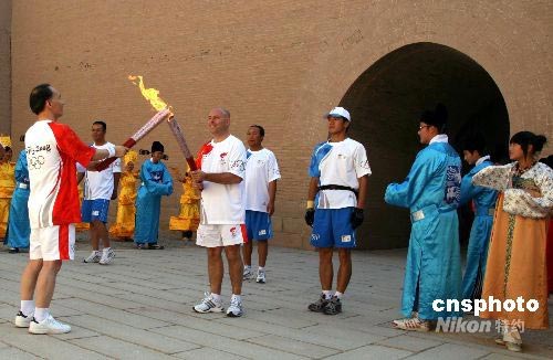 韓國(guó)籍火炬手李賢求(左一)和德國(guó)籍火炬手羅曼在嘉峪關(guān)關(guān)城內(nèi)交接火炬。 中新社發(fā) 周兆軍 攝