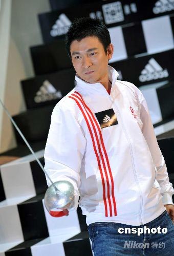 七月八日,北京奧運會合作伙伴adidas在香港舉行“專為北京打造”奧運產(chǎn)品展覽開幕儀式,歌影紅星劉德華出席為活動宣傳造勢,并于活動上模仿?lián)魟幼鳌?中新社發(fā) 鄧慶樂 攝
