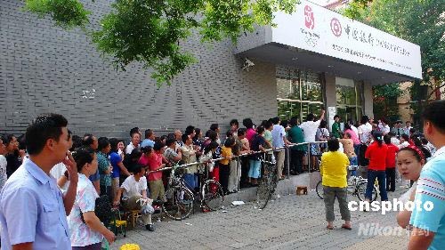 北京社區(qū)居民晝夜排隊(duì)兌換奧運(yùn)紀(jì)念鈔。中新社發(fā) 張愛東 攝