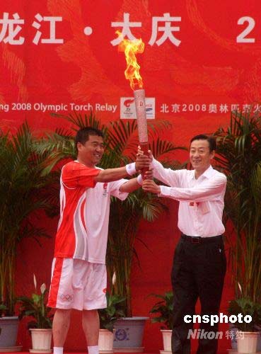 7月12日,北京奧運(yùn)火炬在“石油之城”大慶傳遞,“鐵人鉆井隊”第19任隊長胡志強(qiáng)(左)從大慶市委書記韓學(xué)鍵手中接過第一棒火炬。 中新社發(fā) 周兆軍 攝