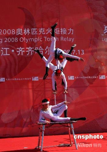 7月13日,北京奧運火炬在“丹頂鶴之鄉(xiāng)”齊齊哈爾傳遞,當?shù)匦‰s技演員打扮成仙鶴模樣,亮出絕技迎接奧運火炬。 中新社發(fā) 周兆軍 攝