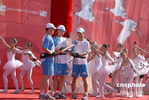 7月13日,北京奧運(yùn)火炬在“丹頂鶴之鄉(xiāng)”齊齊哈爾傳遞。當(dāng)圣火護(hù)衛(wèi)隊(duì)員點(diǎn)燃火炬時(shí),當(dāng)?shù)匦∨笥寻缱饕蝗合生Q在火炬周圍翩翩起舞。 中新社發(fā) 周兆軍 攝