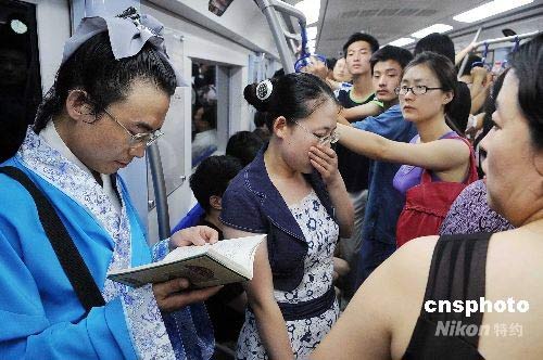 7月13日下午,一男子衣著漢服驚現(xiàn)北京地鐵2號(hào)線,其扮像引來(lái)不少乘客目光。