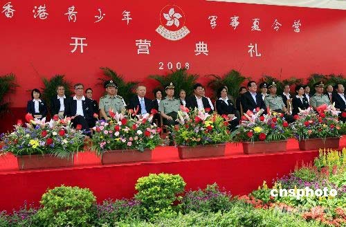 七月十四日,由中國人民解放軍駐港部隊、軍民同樂活動籌委會、德育關(guān)注組及香港特別行政區(qū)教育局合辦的第四屆“香港青少年軍事夏令營”開營典禮在新界粉嶺“新圍軍營”舉行,香港青少年軍事夏令營發(fā)起人董趙洪娉、中聯(lián)辦主任高祀仁、外交部駐港特派員呂新華、駐港部隊司令員張仕波少將、政委劉良凱少將、行政長官夫人曾鮑笑薇等主持開營典禮。中新社發(fā) 張勤 攝