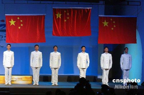 北京奧運(yùn)頒獎(jiǎng)志愿者在北京展示升旗手服裝,在體現(xiàn)中國(guó)傳統(tǒng)文化的同時(shí)又不失陽(yáng)剛之氣。中新社發(fā) 王東明 攝