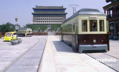 7月21日,當(dāng)當(dāng)車(chē)行駛于改造后的北京前門(mén)大街。據(jù)有關(guān)方面稱(chēng),前門(mén)大街有望在奧運(yùn)會(huì)前的8月1日開(kāi)放。這條街是北京中軸線(xiàn)最重要核心地段,從前門(mén)月亮灣南至珠市口全長(zhǎng)840米,2007年5月動(dòng)工,參照上世紀(jì)二三十年代老前門(mén)的樣子進(jìn)行。當(dāng)當(dāng)車(chē)長(zhǎng)12米,寬2.3米,高3.7米,能夠乘坐84人,單程運(yùn)行需時(shí)約10分鐘,不過(guò)其運(yùn)行能源不再是靠來(lái)自頂上的天線(xiàn),而是本身攜帶的新能源。中新社發(fā)