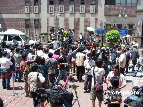 七月二十一日,臺北地方法院開庭審理臺灣海軍前軍官雷學(xué)明控告陳水扁等人誹謗案。這是陳水扁卸任臺灣地區(qū)領(lǐng)導(dǎo)人后首度至法院出庭,臺灣媒體對此高度關(guān)注。圖為庭審結(jié)束后,陳水扁離開時,媒體仍鍥而不舍圍堵其坐車。中新社發(fā) 徐長安 攝