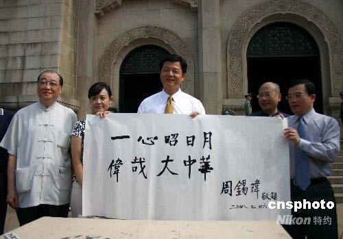 七月二十六日,臺(tái)北縣長周錫瑋率臺(tái)北縣南京參訪團(tuán)一行十人拜謁南京中山陵,題字“一心昭日月,偉哉大中華”。周錫瑋一行二十五日晚間乘坐南京首航后的第四班兩岸周末包機(jī)抵達(dá)南京祿口國際機(jī)場(chǎng),開始為期五天的訪問行程。中新社發(fā) 朱曉穎 攝