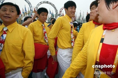 7月27日上午,北京奧運(yùn)會(huì)運(yùn)動(dòng)員村正式開(kāi)村,率先入駐的中國(guó)體育代表團(tuán)舉行隆重的升旗儀式。為了“躲避”眾多志愿者、工作人員的拍攝與簽名,大明星劉翔只好隱身在田徑隊(duì)的隊(duì)友中。中新社發(fā) 任晨鳴 攝