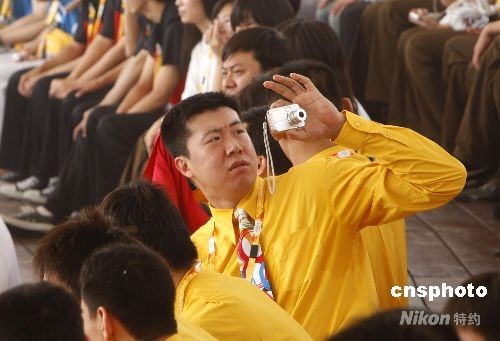 7月27日,北京奧運(yùn)村正式開村,中國籃球隊(duì)隊(duì)員王治郅隨身攜帶了一部照相機(jī),在開村儀式上四處捕捉有趣的畫面留念。中新社發(fā) 杜洋 攝