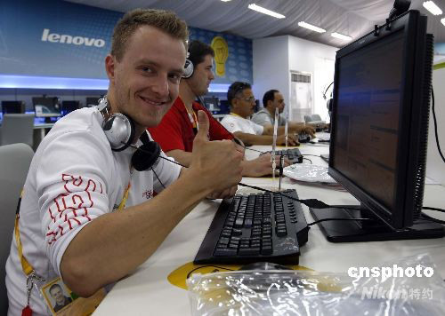 7月29日,一名在北京奧運村網(wǎng)吧上網(wǎng)的外國運動員,豎起大拇指贊揚這里的設施和服務。奧運村網(wǎng)吧從早上8 點開始開放至午夜12點,所有居住在奧運村中的運動員、教練員和官員,均可憑有效證件進入網(wǎng)吧免費享受上網(wǎng)服務。 中新社發(fā) 杜洋 攝