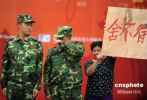8月5日,奧運(yùn)火炬在四川成都傳遞,在傳遞結(jié)束儀式上四川民眾為抗震官兵舉起“舍不得你們走”的標(biāo)語,抗震官兵感動抹淚。 中新社發(fā) 廖攀 攝