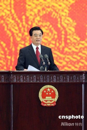 8月8日,中國(guó)國(guó)家主席胡錦濤在北京人民大會(huì)堂宴會(huì)廳為出席北京奧運(yùn)會(huì)的貴賓舉行歡迎宴會(huì)。圖為胡錦濤在歡迎宴會(huì)上致辭。中新社發(fā) 廖文靜 攝