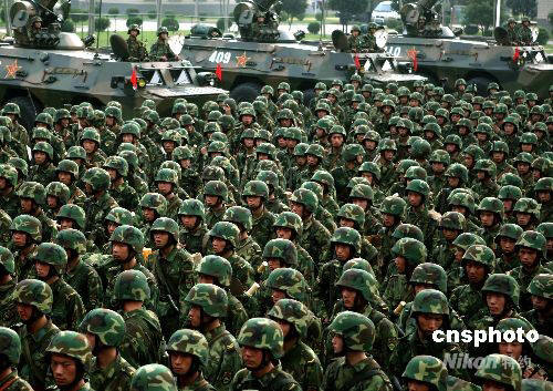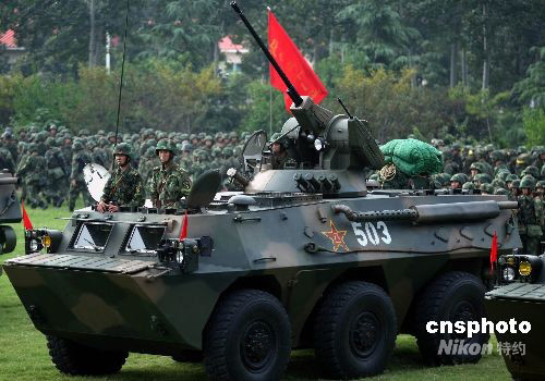 中國人民解放軍“礪兵--2008”演練8月26日拉開帷幕。當(dāng)日下午濟南軍區(qū)某機械化步兵旅參戰(zhàn)部隊,火速集結(jié),進入緊張戰(zhàn)備狀態(tài)。解放軍濟南軍區(qū)這支機械化步兵部隊與北京軍區(qū)一支數(shù)字化部隊舉行的這次跨軍區(qū)聯(lián)合實兵對抗演練,是雙方在為期一個月內(nèi)進行現(xiàn)代條件下“背靠背”的立體化攻防演練,攻擊與反殲雙方將根據(jù)作戰(zhàn)任務(wù)和“情報”實施作戰(zhàn)計劃,以磨練部隊的戰(zhàn)斗能力。中新社發(fā) 宋吉河 攝