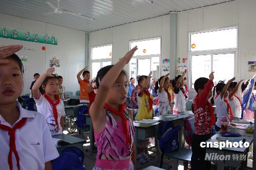 9月1日,四川省兩萬多所中小學新學期開學,五十一個地震重災縣的五千九百七十九所中小學校百分之百復課。圖為都江堰最大的板房學校皖川中心校的孩子們在教室里舉行升旗儀式。中新社發(fā) 黃永莉 攝