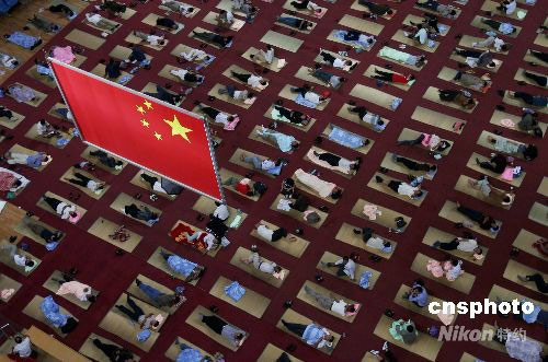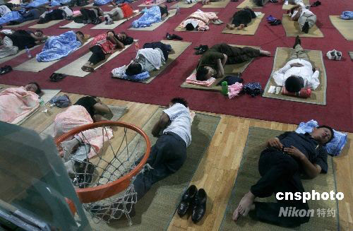 2008年9月3日,華中師范大學(xué)在開學(xué)首日為新生家長(zhǎng)們提供免費(fèi)住宿。許多學(xué)生家長(zhǎng)暫住在校方免費(fèi)提供的室內(nèi)大地鋪上。中新社發(fā) 攝記 攝