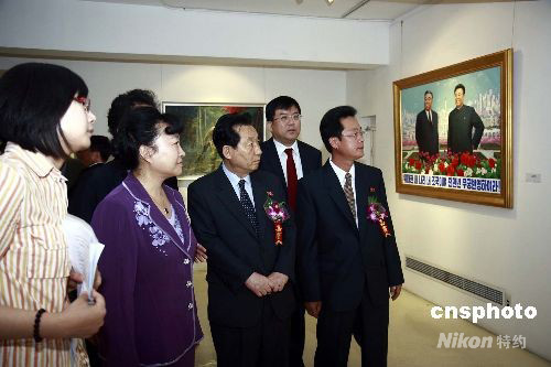 由中華人民共和國(guó)文化部、朝鮮民主主義人民共和國(guó)文化省主辦,中國(guó)對(duì)外藝術(shù)展覽中心承辦的“為紀(jì)念朝鮮民主主義人民共和國(guó)成立六十周年-朝鮮美術(shù)展”18日在北京中外博藝畫廊開幕。此次展覽展示了朝鮮著名功勛藝術(shù)家、人民藝術(shù)家、以及青年畫家創(chuàng)作的朝鮮畫、油畫、版畫、刺繡等美術(shù)作品五十九幅。圖為出席開幕式的中華人民共和國(guó)文化部文化部副部長(zhǎng)趙少華(右四)、朝鮮民主主義人民共和國(guó)駐華大使崔鎮(zhèn)洙(右三)等在觀展。中新社發(fā) 邢利宇 攝