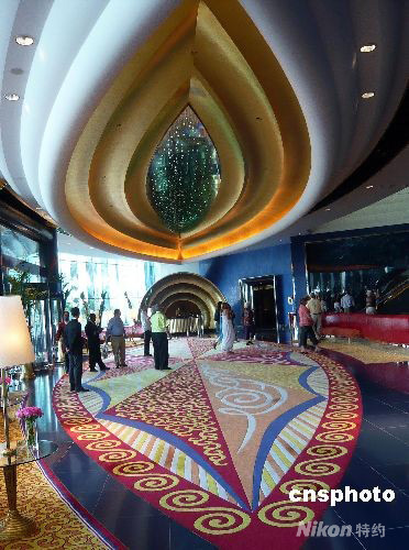 圖為帆船酒店具有阿拉伯民族傳統(tǒng)文化風格裝飾的豪華大廳。中新社發(fā) 錢興強 攝