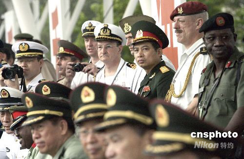 武官團(tuán)觀看了駐軍的軍事科目演示。中新社發(fā) 張勤 攝