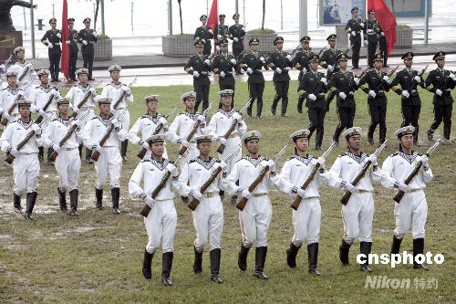 圖為駐港部隊(duì)槍械團(tuán)體操表演。中新社發(fā) 張勤 攝