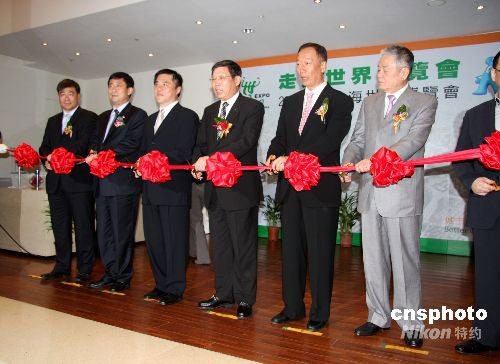 9月22日,“2010上海世界博覽會(huì)推介會(huì)”暨“走進(jìn)世界博覽會(huì)”展覽活動(dòng)在臺(tái)北舉行。臺(tái)北市市長(zhǎng)郝龍斌(左三)、上海常務(wù)副市長(zhǎng)楊雄(左四)、臺(tái)灣鴻海集團(tuán)董事長(zhǎng)郭臺(tái)銘(左五)等出席開幕式并剪彩。中新社發(fā) 陳立宇 攝